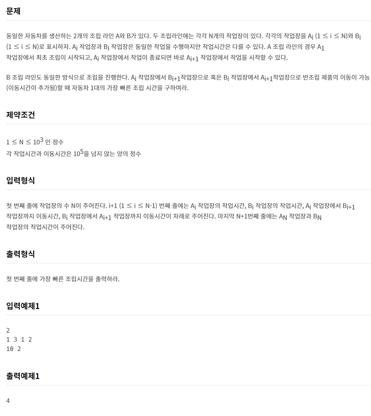 dp[i] = [min(dp[i-1][0], dp[i-1][1] + assembly_line[i-1][3]) + assembly_line[i][0], # A 조립라인